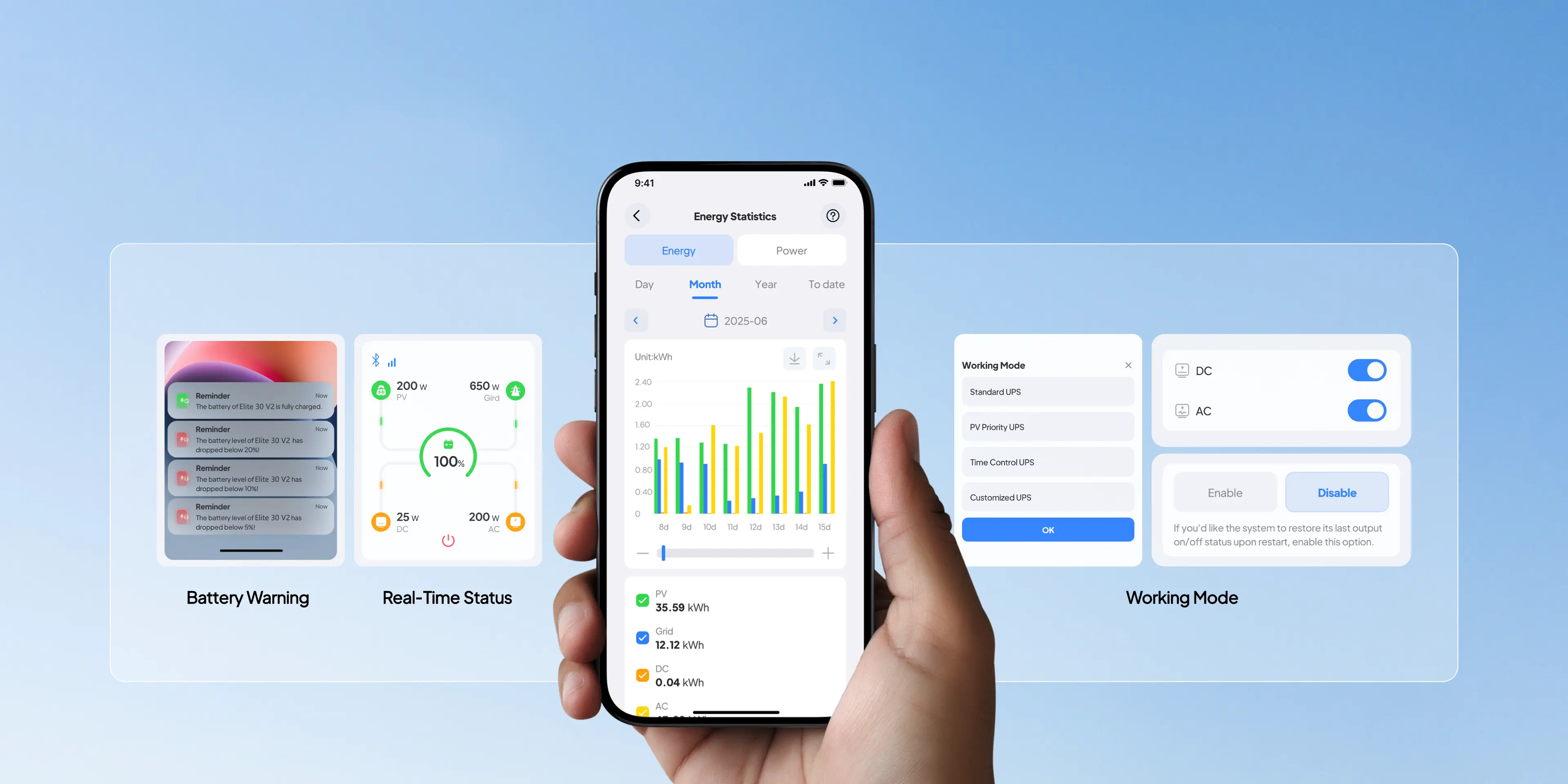 With the BLUETTI app, you're in total control of your Elite 30 V2. Set charging speed and power limits, schedule operations to match your routine, and enable "Memory Mode" so your unit remembers preferred settings even after a blackout. Plus, real-time monitoring via WiFi or Bluetooth gives you insights into performance anytime, anywhere.